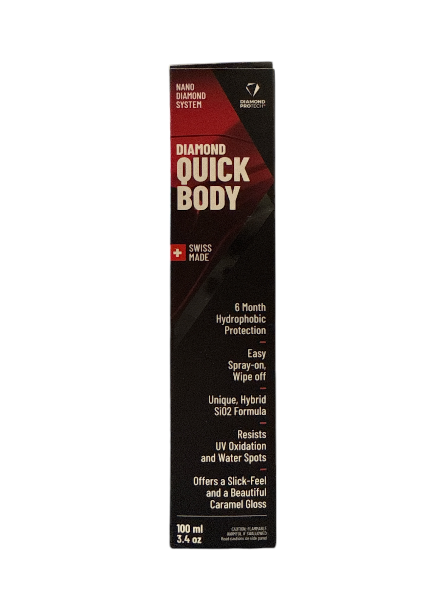 Diamond Quick Body is an effortless, nanodiamond hybrid Si02 spray coating that yields 6 months of hydrophobic protection. This spray and wipe formula will create a slick, caramel gloss appearance on any coated or non-coated vehicle. Immediately results in a finish that will resist UV oxidation and repel water easily.