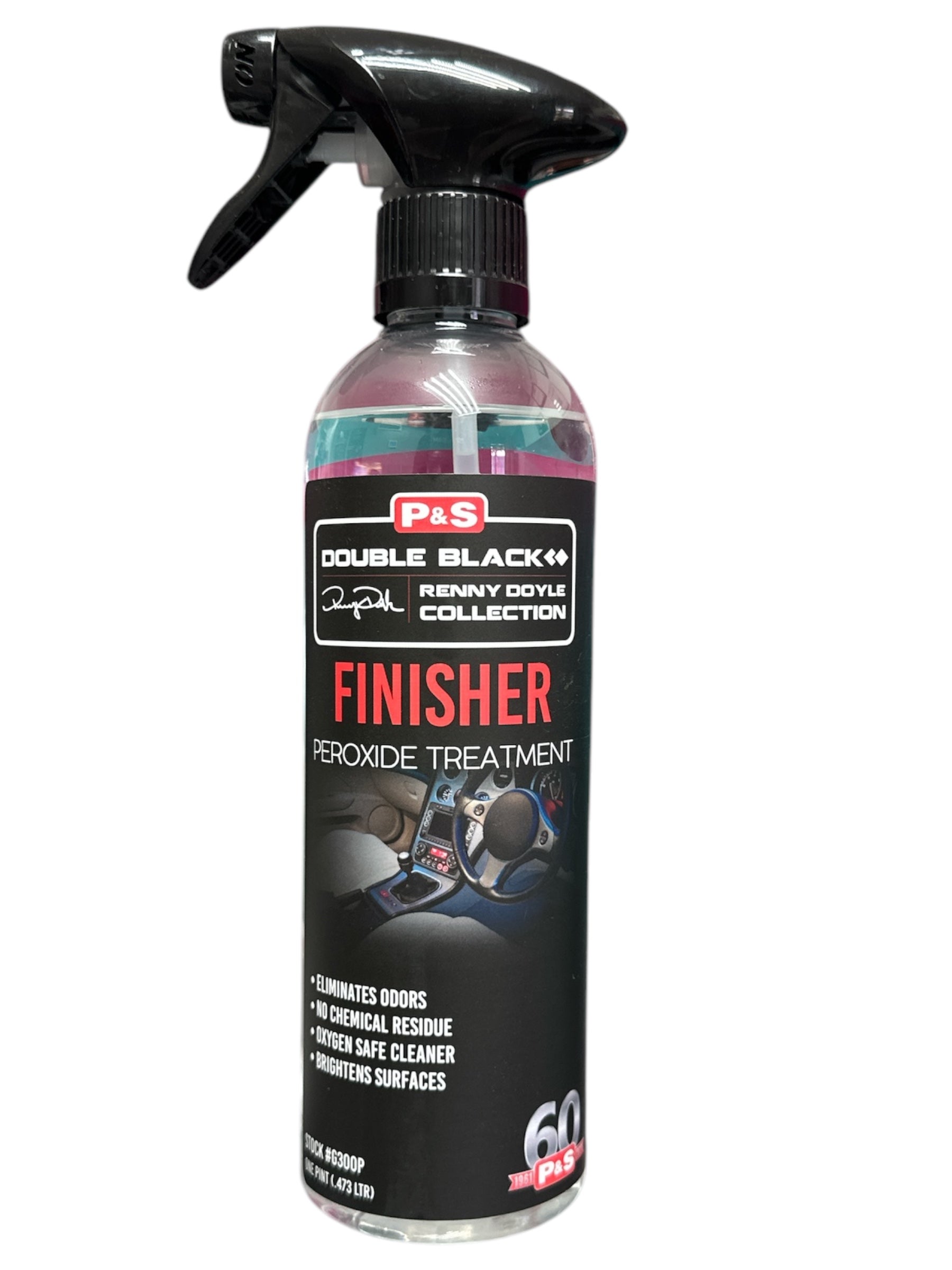 Finisher Peroxide Treatment is Step #3 in the Double Black Interior Cleaning System. Finisher completes the system by adding a final attack on odor causing molecules and organic stains. Finisher breaks down odor causing chemicals, eliminates any residual organic stains and slightly sterilizes the surface. Finisher assists in reducing water stains, mold and mildew odors as well as finalized stain removal. Finisher breaks down into oxygen and water, leaving no chemical residue left that requires further removal.